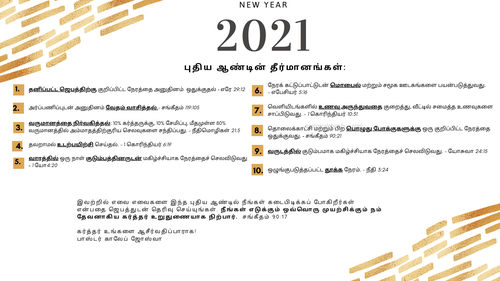 இந்த ஆண்டைக் கடந்து புதிய ஆண்டிற்குள் பிரவேசிக்கும்போது, நம் பரலோக தகப்பனின் பிரசன்னமும், பாதுகாப்பும் உங்களோடிருந்து உங்களை மகிழ்ச்சியினாலும், ஆனந்தத்தினாலும் நிறைக்கவேண்டுமென்று உங்களுக்காக ஜெபிக்கின்றோம்.